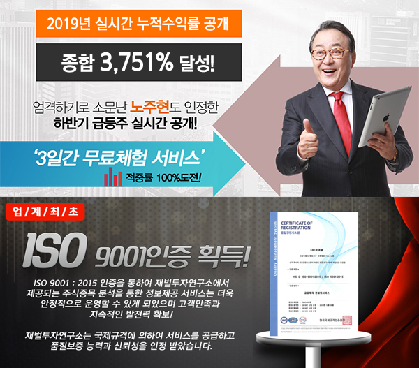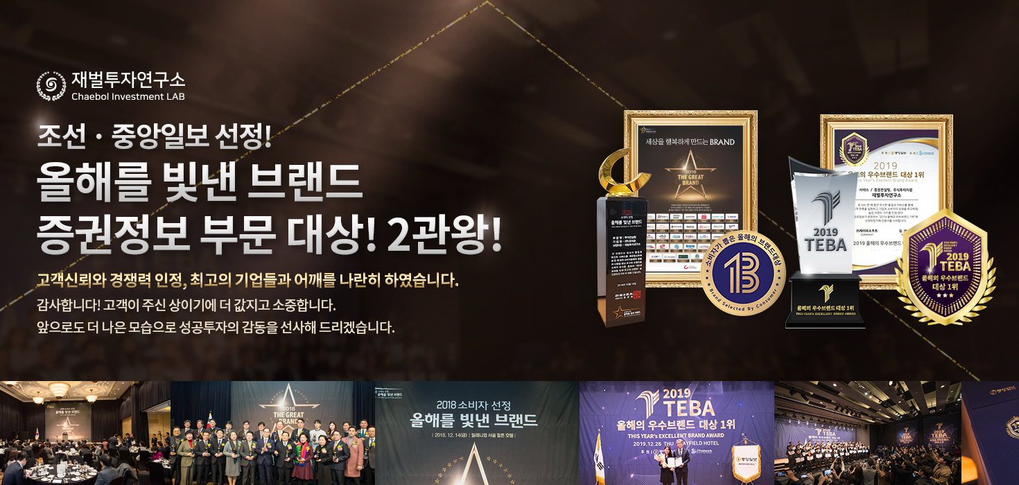이에 안정성과 신뢰성에 있어 정도투자의 원칙을 고수하면서 여타의 동종업체와 비교했을 때 월등하고도 안정적인 수익률을 자랑하고 있다. 이와 같은 재벌투자연구소의 검증된 신뢰성과 특화된 시스템으로 인한 높은 수입률은 올해를 빛낸 브랜드 증권 정보 대상 3관왕 수상의 영예로 이어졌다.