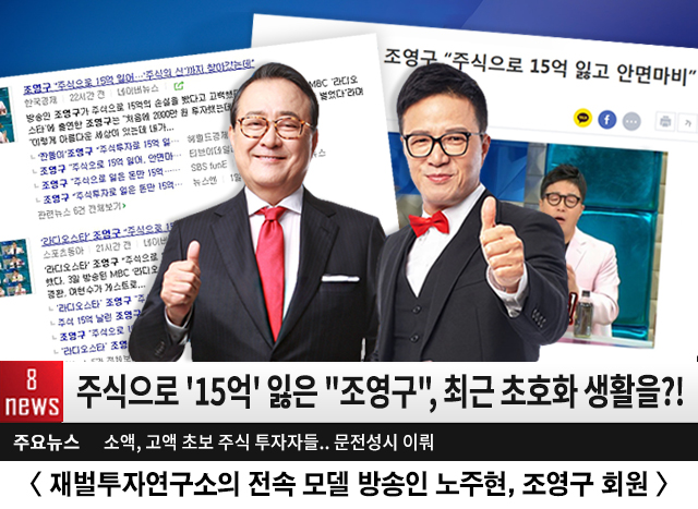 조영구씨는 과거 아무런 도움 없이 혼자서 주식투자를 진행하다가 15억원의 손해를 본 바 있다. 이에 조영구씨는 연예계에서 반듯하고 자산관리에 있어 엄격하기로 잘 알려진 노주현씨가 재벌투자연구소의 전속모델이라는 사실을 접하고서 직접 주식투자 서비스를 받고 재벌투자연구소의 전속모델로써 활동 의사를 피력했다고 업체 측은 전했다.