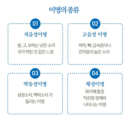 이명’, 삐이 같은 ‘고음성 이명’, 심장 박동이나 맥박 소리가 들리는 ‘박동성이명’, 턱관절장애나 목 어깨 통증 등과 함께 나타나는 ‘체성 이명’ 등으로